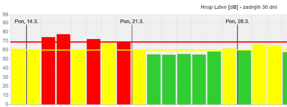 Merilniki so opremljeni tudi z mikrofonskimi sklopi, ki merijo hrup, kot ga dojemamo ljudje. Naši merilniki poslušajo 24/7, vse dni v letu. Le na ta način lahko ugotovimo, kdaj se pojavlja hrup, ki je za človekove zaznave moteč.